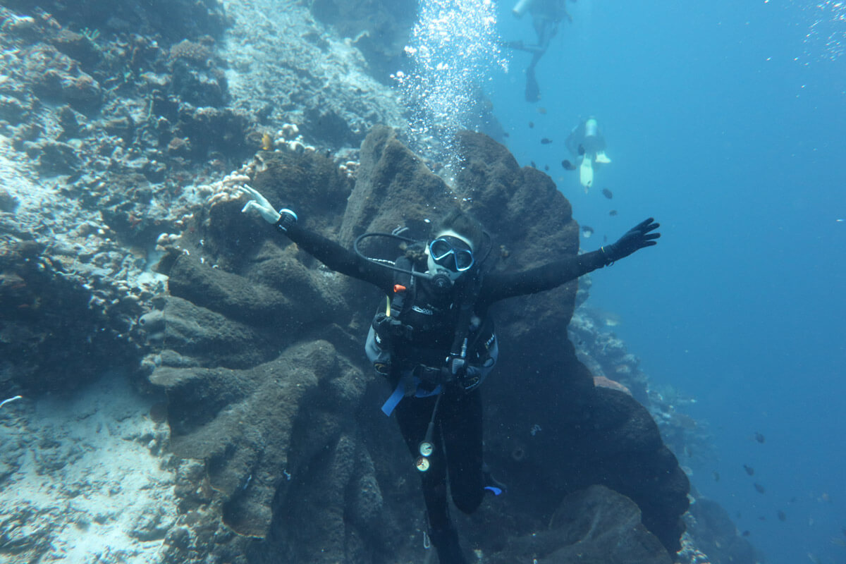 A dive I will always remember is my first nigh dive at the wooden wreck of Komodo. I have to admit I feared this one, and rightly so, the first minutes are very stressful as the only thing I see going down are the torches of my dive buddies pointing towards the abyss of the sea. But as soon as we hit the depth of 12 meters and I sight the shipwreck, everything becomes fabulous. We spot a lot of interesting creatures as we swim our way through the wreck. You never know what is going to show at the end of your torche’s light, and I find it pretty exciting.